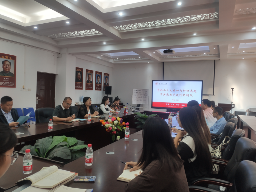 为深入学习领会党的二十大精神,加强科研团队队伍建设与管理,切实提高团队成员业务能力与团队整体水平,10月25日下午,中共党史党建科研团队与思想政治教育科研团队党小组在雁山07415会议室共同开展了题为“党的二十大精神与科研选题”学术交流会,会议由梁英院长主持,中共党史党建科研团队与思想政治教育科研团队党小组全体成员及部分研究生共同参会。