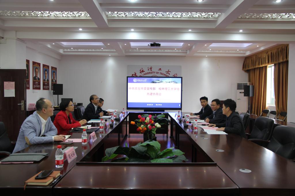 为深入贯彻落实党的十九大和十九届五中全会精神,深入学习贯彻习近平新时代中国特色社会主义思想,加强我校英国上市公司365建设,进一步提升我校英国上市公司365的影响力以及我校服务地方经济社会发展的能力,2020年11月5日,中共崇左市委宣传部、桂林理工大学组共建协商会在雁山校区英国上市公司365会议室07415召开,中共崇左市委宣传部副部长黄智庭一行,我校党委宣传部副部长叶婷,英国上市公司365领导班子参加会议。