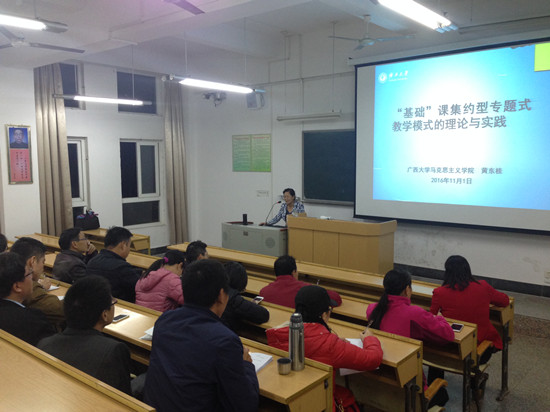 11月1日晚,广西大学英国上市公司365黄东桂教授在屏风校区为我院思想政治理论课教师作了题为“‘基础’课集约型专题式教学模式的理论与实践”的学术报告会。报告会由学院副院长梁英主持。