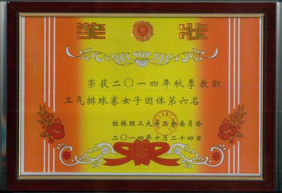 为了更好地关爱教职工的身体健康,10月13日至27日,2014年桂林理工大学气排球比赛在校体育馆三楼举行,学校共有25支参赛队伍。在此次排球比赛中,我院教工女排队取得佳绩。 比赛中,学院女排选手精神抖擞,顽强拼搏,不畏强手,勇于争胜,团队协作,取得了团体第六名的好成绩,超越了过去的纪录。此次好成绩的取得得益于学院的精心组织和日常练习。学院工会在课余时间,积极组织学院教工锻炼身体,提升了老师们的竞技水平,学院教工的集体主义感和凝聚力在活动中不断加强,同时保持了积极向上的精神面貌。