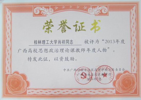 近日,广西壮族自治区教育厅公布了“2013年度广西高校思想政治理论课教师年度人物”评审结果,我院副院长肖祥教授获此荣誉称号。