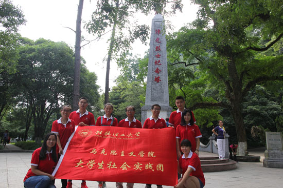 学院2015年“追寻红色足迹”暑期社会实践团搜寻桂林市和周边县城的红色资源,参观走访了桂林保卫战遗址、三将军及八百壮士墓、陈光烈士纪念碑、八路军驻桂林办事处纪念馆、《抗日烽火映桂林》展览、临桂飞虎队遗址公园、苏联陆军中校巴布什金烈士墓、广西省立艺术馆等红色革命地,搜集了大量的调研材料,并在现场举办重温入党誓词、凭吊革命先烈等活动,开展现场教学活动,深切感受革命先烈艰苦奋斗以及中国共产党90多年来的光辉历程。