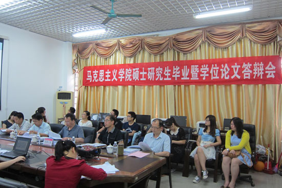 6月6日和6月7日,学院2014届硕士研究生学位论文答辩会顺利举行。思想政治教育和马克思主义基本原理两个专业共26位毕业生参加了答辩。答辩会邀请了自治区地质矿产勘查开发局党组书记唐善茂教授和广西师范大学博士生导师黄瑞雄教授分别担任答辩委员会主席,学院研究生导师、2014届硕士研究生参加了此次答辩会。