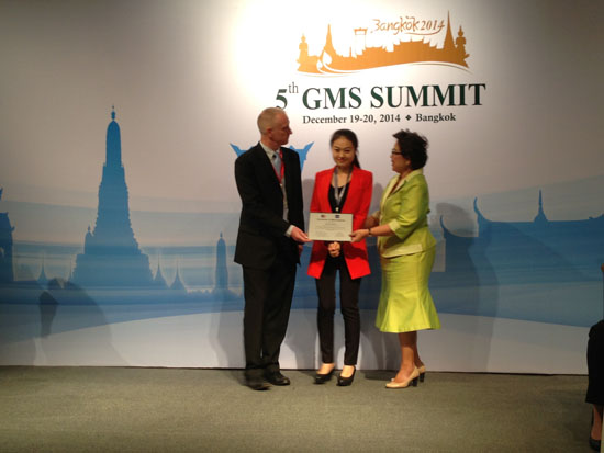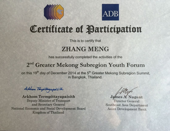 12月9日—19日,英国上市公司365研究生张萌同学作为中国青年代表在泰国首都曼谷参加了由亚洲开发银行主办的第二届大湄公河次区域经济六国青年论坛(2nd Great Mekong Subregion Youth Forum)。在论坛举办的大篷车考察活动中,来自大湄公河次区域经济的六个成员国(中国、老挝、泰国、缅甸、越南、柬埔寨)的36名青年代表与亚洲开发银行(ADB)领导及项目负责人就六国的交通、能源、环境、医疗、旅游、经济、人力资源等方面进行调研。在艰苦调研的基础上,张萌同学代表中国青年向与会领导嘉宾作了本次大篷车考察活动相关议题的总结汇报,并被授予了第二届GMS六国青年论坛青年代表证书。
