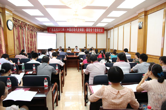 6月24日至26日,由广西教育厅主办、我院承办的广西高校2013年《中国近现代史纲要》课程骨干教师培训班在我校屏风校区举行。学校党委副书记、纪委书记赵君出席开班典礼并代表学校致欢迎辞。广西高校《中国近现代史纲要》课程专家组成员和来自全区29所本科院校的近50位《中国近现代史纲要》课程负责人、骨干教师参加了此次培训班,开班典礼由学院院长王青山主持。