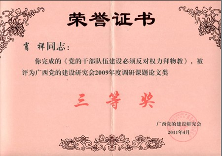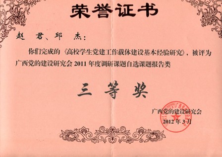 日前,广西党的建设研究会颁发文件《关于表彰广西党建研究会2011年度调研课题优秀成果的通知》(桂党研文[2012]第2号),我院2篇论文在本次评奖中获奖。我院赵君、邱杰同志的论文《高校学生党建工作载体建设基本经验研究》被评委广西党的建设研究会2011年度调研课题自选课题报告类三等奖,肖祥同志的论文《党的干部队伍建设必须反对权力拜物教》被评为广西党的建设研究会2009年度调研课题论文类获得三等奖。