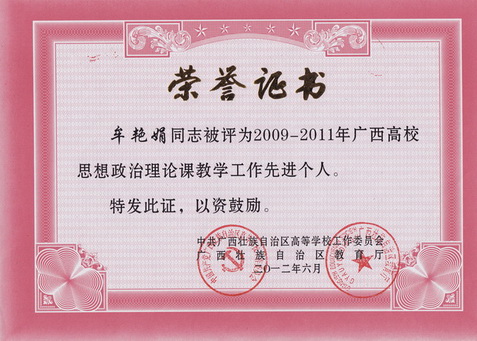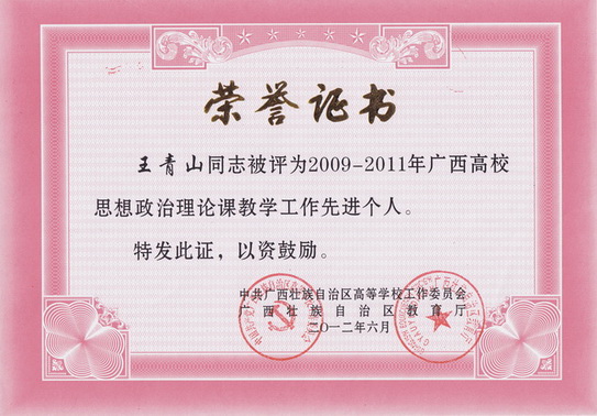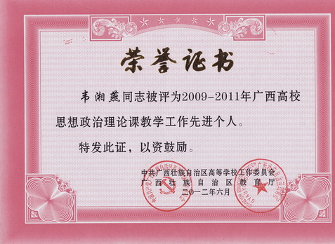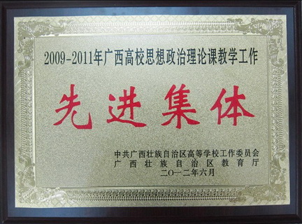 近年来,我院高度重视思想政治理论课建设工作,坚持教学和科研并重,扎实推进思想政治理论课建设和理论研究,努力提高思想政治教育的针对性、时效性,取得了显著的成绩。日前,自治区高校工委、教育厅下发《关于表彰2009—2011年广西高校大学生思想政治教育工作先进单位、先进集体和先进个人的决定》,对2009—2011年全区高校思想政治教育工作中涌现的先进集体和先进个人进行表彰。我院荣获“广西高校思想政治理论课教学工作先进集体”荣誉称号;学院王青山、牟艳娟、韦湘燕三位同志被评为“广西高校思想政治理论课教学工作先进个人”。希望全体教师以此荣誉为动力,进一步推动我院我院思想政治理论课建设和学科发展水平。