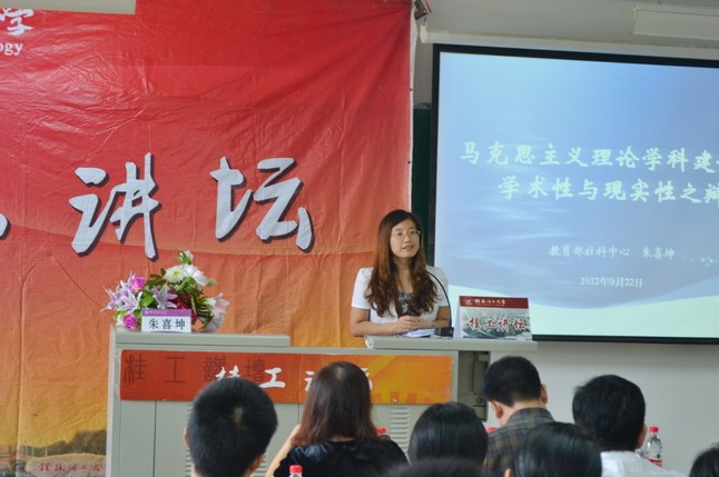 9月22日上午,教育部高等学校社会科学发展研究中心副研究员、我校兼职教授朱喜坤做客桂工讲坛,在雁山校区06102教室为我校师生作了题为“马克思主义理论学科建设的学术性与现实性之辩”的学术报告。学校党委副书记、纪委书记、英国上市公司365院长赵君教授出席报告会并讲话,学院党委书记、常务副院长王青山教授主持报告会,学院全体师生和全校辅导员到场聆听了报告。