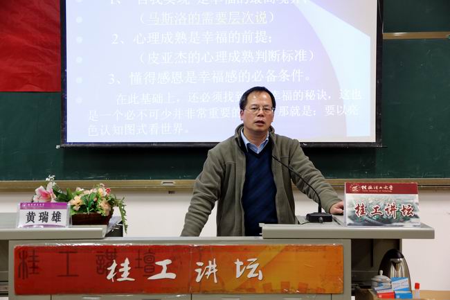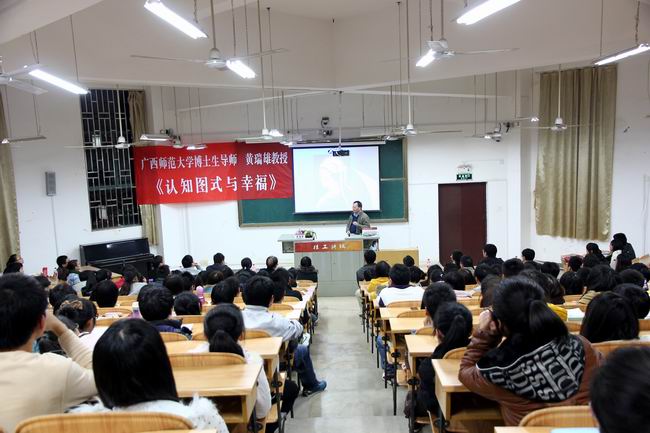 2012年12月6日晚,广西师范大学博士生导师黄瑞雄教授在雁山校区07519教室向我校广大师生作了题为“认知图式与幸福”的学术报告。我院党委书记、常务副院长王青山教授出席报告会,学校学生工作部(处)副部(处)长张雷主持报告会,全校近300名学生到场聆听了报告。