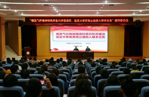 11月9日下午,崇左市委宣传部副部长黄智庭应邀为我院师生作题为“理直气壮地加强高校意识形态建设 坚定不移地贯彻立德树人根本任务”的形势与政策报告。报告于雁山校区图书馆报告厅举行,由我院党委书记耿俊茂主持,我院教师、学工教师代表以及全体研究生参加。