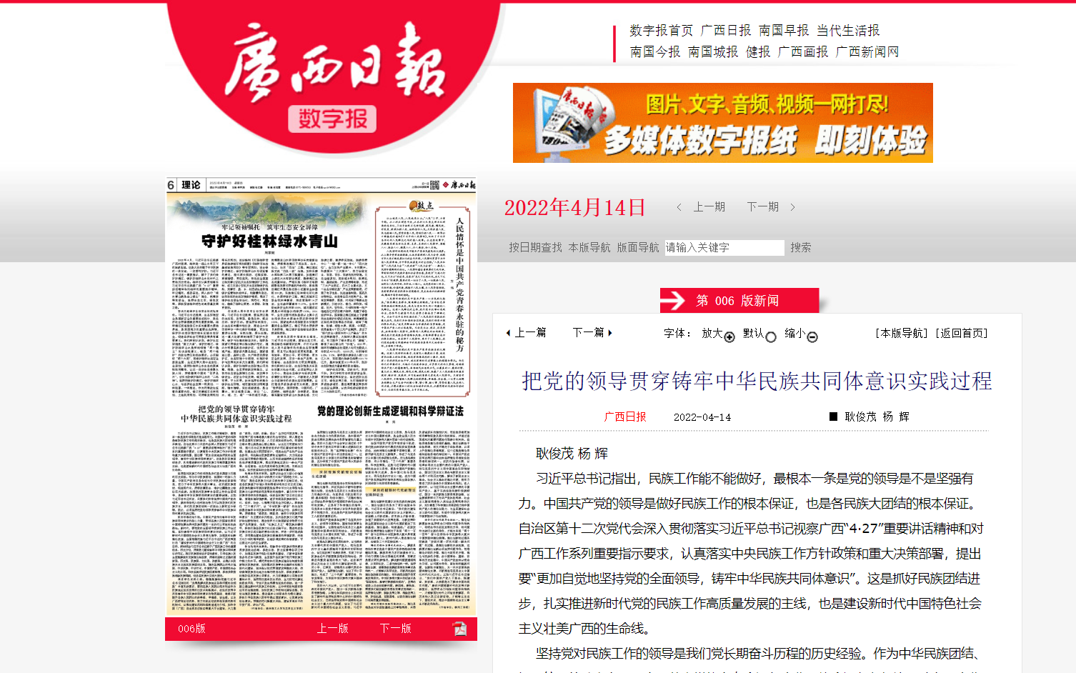2022年4月14日,我院2020级研究生杨辉在《广西日报》第6版(理论)发表理论文章:《把党的领导贯穿铸牢中华民族共同体意识实践过程》。历年来,我院高度重视学科建设与人才培养,积极打造党建+特色品牌,积极引导学院师生党员将专业知识融入党建特色实践活动中,理论与实践相结合,学以致用,在实践中提升理论素养和专业技能。