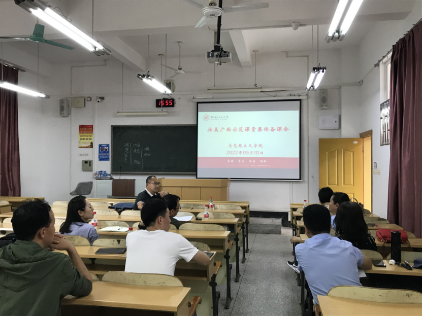 为扎实推进习近平总书记视察广西时的重要讲话精神进教材、进课堂、进头脑,落实自治区教育厅关于建设“壮美广西”系列思政课“示范课堂”工作。5月10日,我院在屏风校区9306、9308和9310教室召开了壮美广西示范课堂集体备课会,学院党委书记耿俊茂、院长梁英和学院思政课教师参会。
