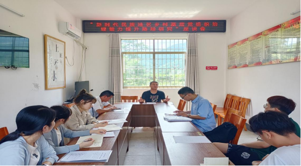 调研组另一队成员在刘术刚老师的带领下首先前往黄关镇顺溪村,驻村第一书记单江涛就顺溪村基本情况进行了简单介绍,随后分队成员与相关人员就新时代民族地区乡村基层党组织治理能力提升路径、搬迁移民社区治理共同体以及乡村如何铸牢中华民族共同体意识等主题开展调研座谈会。座谈会后,分队成员前往灌阳县政府,了解当前灌阳县乡村振兴工作开展情况,分队成员有针对性地就当前灌阳县特色产业发展情况、移民搬迁工作开展情况、基层党组织人才队伍建设以及基层党组织在开展乡村振兴、基层治理、公共服务等方面存的问题及原因与工作人员进行了深入交谈。