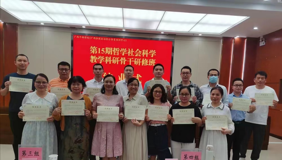 为深入学习贯彻习近平总书记关于哲学社会科学工作的重要论述,全面贯彻落实党的十九届六中全会精神和自治区第十二次党代会精神,着力提高哲学社会科学教学科研人员的能力水平,7月3日至9日,我院教师在广西干部学院参加第15期哲学社会科学教学科研骨干研修班培训活动。此次培训由自治区党委宣传部举办,我院教师代表参加。