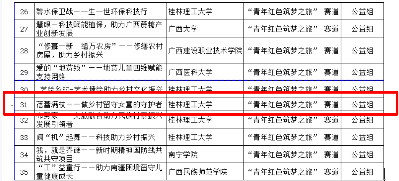 日前,自治区教育厅公布了第八届中国国际“互联网+”大学生创新创业大赛“数广集团杯”广西赛区选拔赛获奖名单,我院《“蓓蕾满枝”——做乡村留守女童的守护者》项目在此次比赛中喜获广西赛区选拔赛“青年红色筑梦之旅”赛道银奖的好成绩。