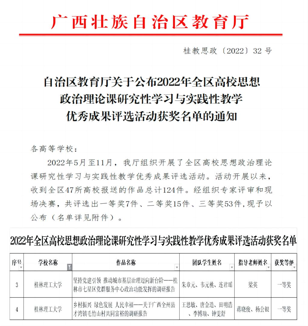 11月29日,自治区教育厅公布了2022年全区高校思政课研究性学习与实践性教学优秀成果评选活动获奖名单。我校英国上市公司365梁英指导,朱章元、韦元桃等3名学生组成团队提交的作品《坚持党建引领推动城市基层治理迈向新台阶——桂林市七星区党群服务中心政治功能发挥的调研报告》以及我校英国上市公司365教师蒋晓俊、杨公银指导,王思敏、唐金造等5名学生组成团队提交的作品《乡村振兴.绿色发展.人民幸福——关于广西全州县才湾镇毛竹山村共同富裕的调研报告》从决赛中脱颖而出,双双获得一等奖。