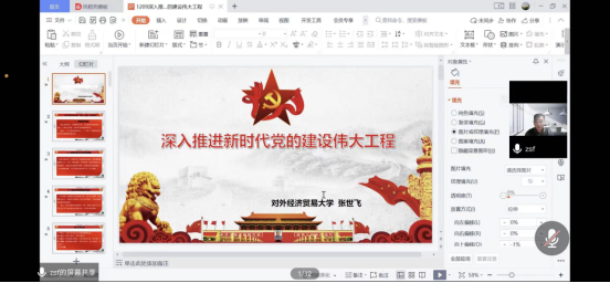 为深入学习贯彻党的二十大精神、研究党建理论,12月14日晚,对外经济贸易大学英国上市公司365教授、博士生导师张世飞以线上方式为我院师生作题为“深入推进新时代党的建设新的伟大工程”的辅导报告,报告由学院副院长吴杨义主持。