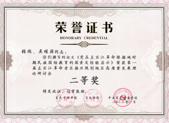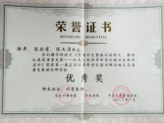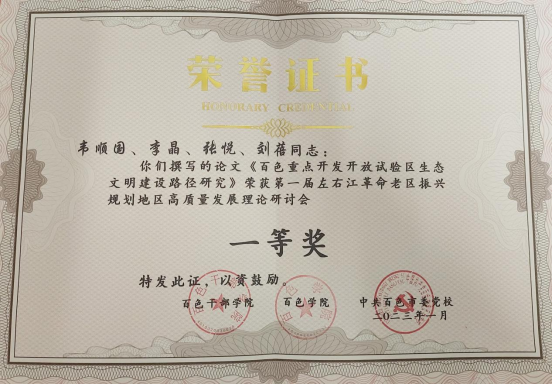 在前期接到征文的消息后,我院组织研究生踊跃投稿,研究生导师们主动对学生的论文选题及写作进行了精心指导。经过专家评审,由我院硕士生导师韦顺国副研究员指导研究生李晶、张悦、刘蓓撰写的《百色重点开发试验区生态文明建设路径研究》荣获一等奖,我院硕士生导师张瑞教授指导研究生吴桂源撰写的《党在左右江革命根据地时期民族团结教育的探索及经验启示》荣获二等奖,我院硕士生导师陆平教授指导研究生陈彩宣、陈文涛撰写的《坚持以文塑旅以旅彰文,推动红旅高质量发展-红色文化对革命老区振兴发展的启示》荣获优秀奖。