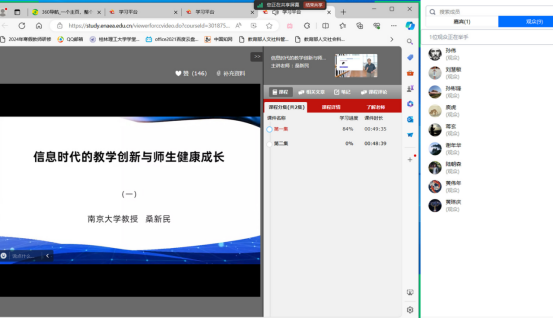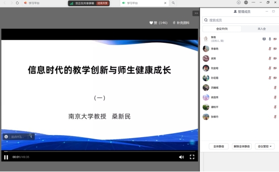 近日,我院以教研室、办公室为单位组织开展了“师德大讲堂”2024年 (第1期)活动,通过中国教育干部网络学院网络学习平台观看聆听了南京大学教育研究院教育科学与管理系网络化学习与管理研究所所长桑新民的“信息时代的教学创新与师生健康成长”主题报告,全体教职工参加。