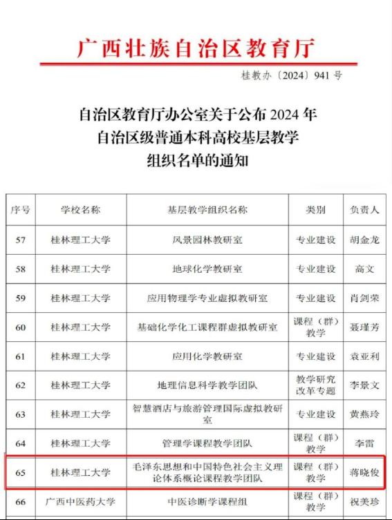 近日,自治区教育厅办公室正式公布了2024年自治区级普通本科高校基层教学组织的评选结果,我院再传喜报!由蒋晓俊教授领衔的“毛泽东思想和中国特色社会主义理论体系概论”课程教学团队,凭借其出色的教学质量、创新的教学方法以及对课程思政理念的深度融入,成功获评自治区级普通本科高校基层教学组织。