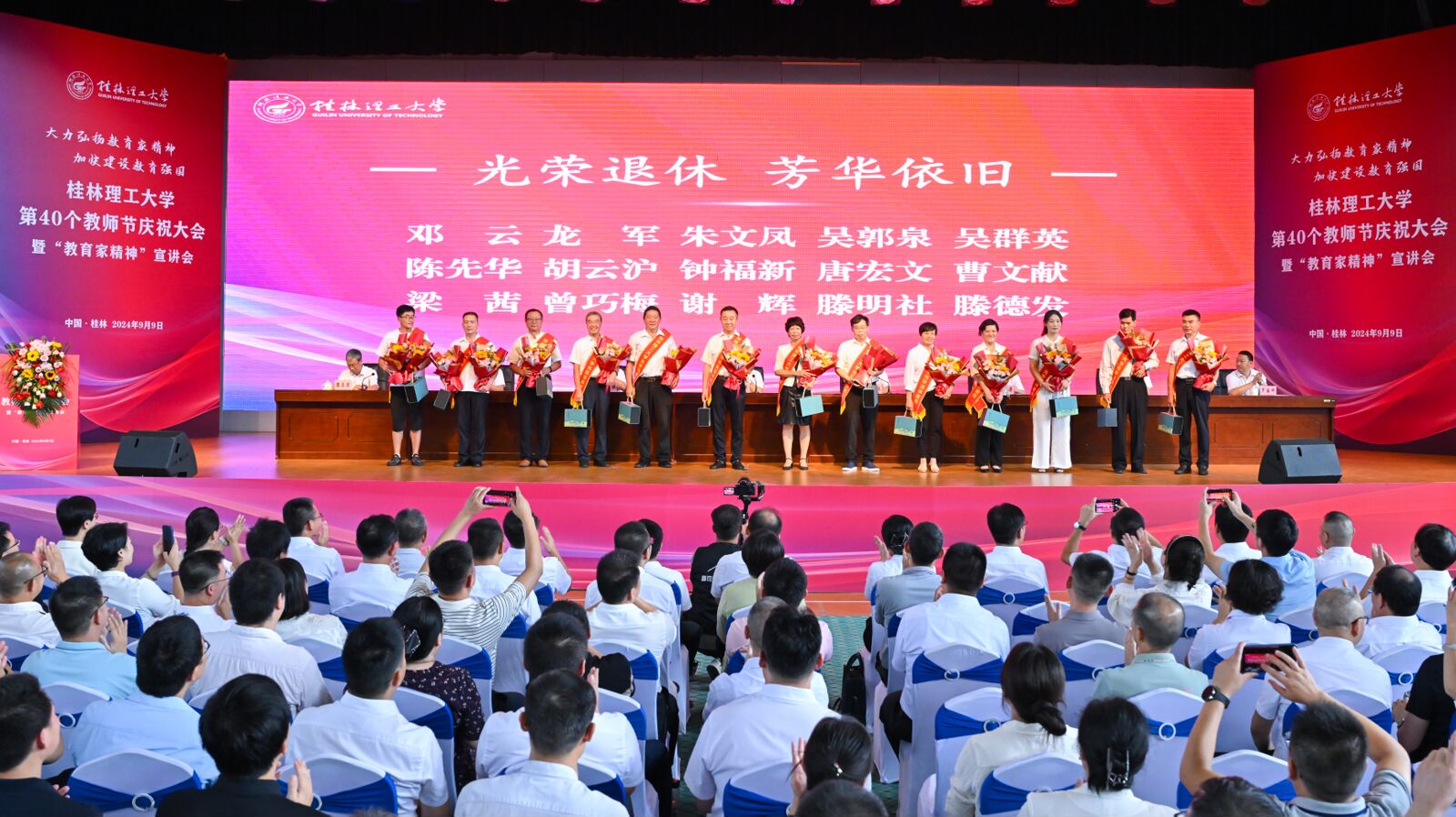 学院教师接受教师节表彰。9月9日下午,在学校举行的第40个教师节庆祝大会暨“教育家精神”宣讲会上,学校领导为第二届广西高校党务工作者基本功大赛一等奖获得者蒋晓俊颁奖、为近期荣休的梁茜老师举行了荣休仪式。