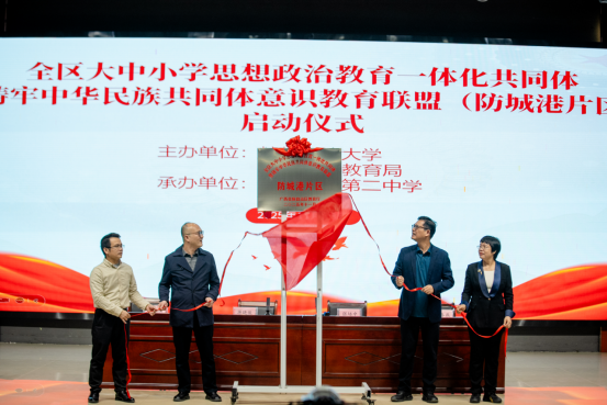 与会主要领导共同为全区大中小学思想政治教育一体化共同体暨铸牢中华民族共同体意识教育联盟(防城港片区)揭牌。