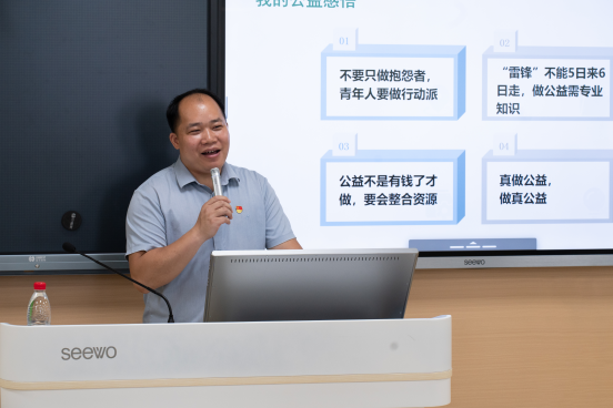 课上,黄小华老师提出了“道德模范高大上,不可学吗”、“个人品德仅仅了解、知道就可以了吗”、“积极进行道德实践有哪些的途径和方式”等系列问题,与何乃柱老师面对面互动。何乃柱老师结合自己从大学期间至今二十年来投身青年志愿服务的经历一一做出了回应,与同学们分享了他坚持组织参与公益的初衷与动力。他组织或参与多项助残、助学、助孤、助老、助童活动;传播公益知识,开展公益人才培训,推动公益组织联盟建立与合作;指导多项广西师范大学志愿服务项目,参与打造志愿服务品牌,参与研发公益志愿服务课程等。心怀感恩、自觉担当的精彩事迹,感染着课堂上的同学们,赢得同学们的阵阵掌声。