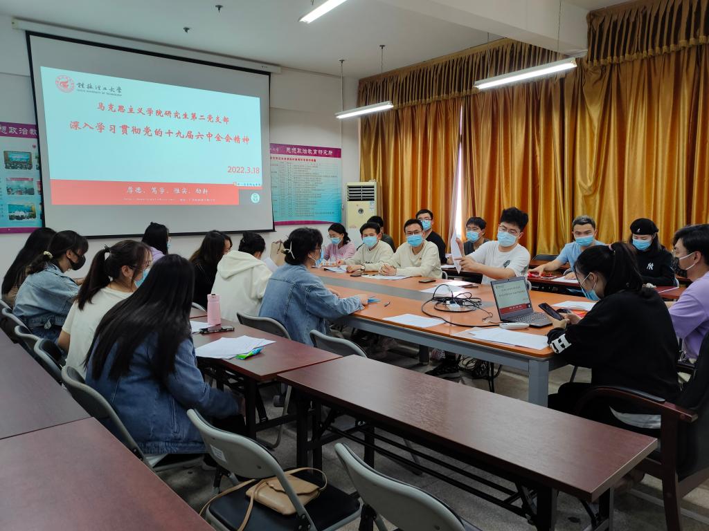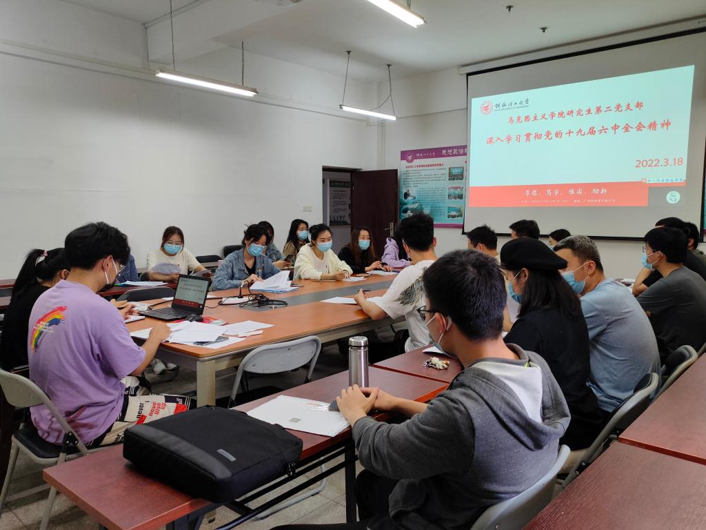 为深入学习贯彻党的十九届六中全会精神,更好地用全会精神武装头脑、指导实践,研究生第二党支部于3月18日在07407教室组织开展了学习贯彻党的十九届六中全会精神专题党课。党支部全体党员通过线上、线下相结合的方式参加了此次活动,会议由党支部书记蒋建主持。