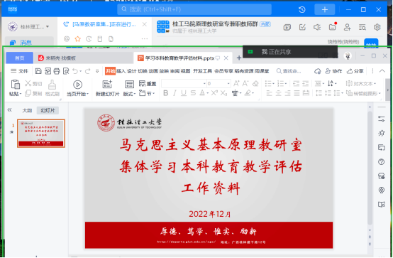 为进一步做好审核评估评建工作,推动基层一线教师深入理解新一轮教育教学审核评估相关知识,力争做到“人人了解评估、人人参与评估、人人都是评估对象”,12月20日,马克思主义基本原理教研室全体教师,依托线上会议的方式,开展《桂林理工大学本科教育教学评估学习手册》学习交流会。会上,结合学习内容,老师们陆续发言并明确表示,在日常教学工作中,将着力推进思政课教学“立德树人”的根本任务,把人才培养质量要求落实到课堂,特别是学生的学习成效上;将结合桂工特色,将校园文化、典型事迹融入教学中,扎实培养德智体美劳全面发展的社会主义建设者和接班人,为党育人、为国育才,确保学生真学、真信、真用。