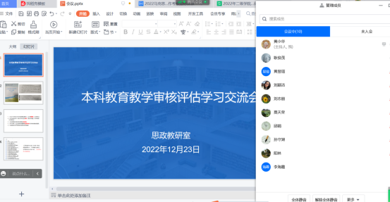 2022年12月23日,思政教研室在线上召开本科教育教学审核评估学习交流会,教研室所有老师参加此次会议。