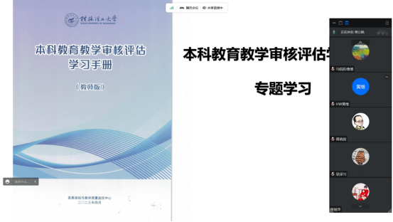 根据学校、学院的统一部署,为了更好地做好迎接本科教育教学审核评估工作,4月30日下午,概论教研室采取线上会议的方式召开了《本科教育教学审核评估学习手册》专题学习会议,会议由教研室主任杨公银主持,学院副院长蒋晓俊和其他专兼职教师出席了本次会议。