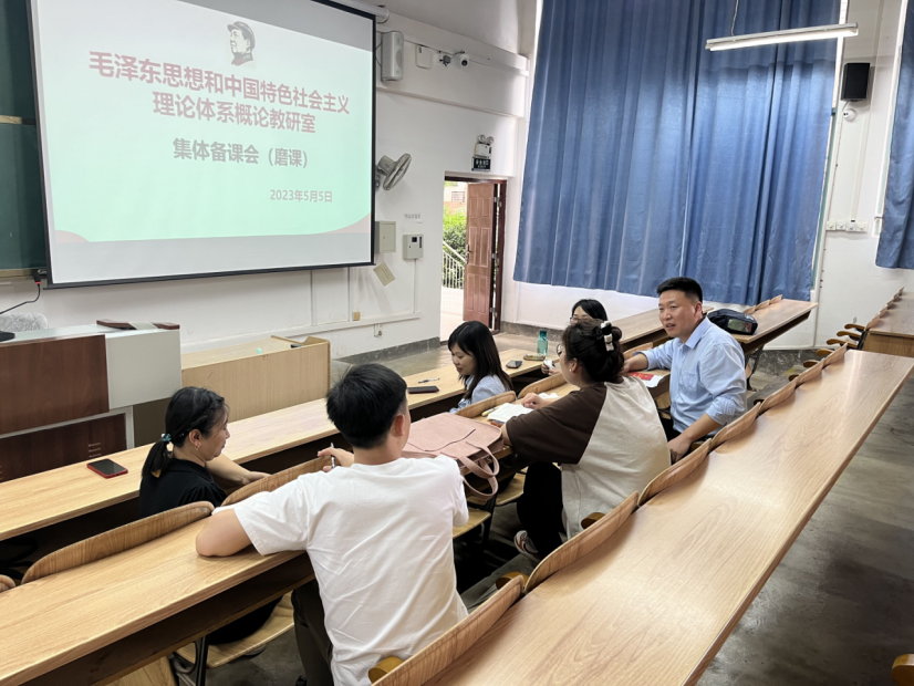 为深入落实学校本科教育教学审核评估的文件精神和工作要求,进一步提升我院教师教育教学水平。2023年5月5日,毛泽东思想和中国特色社会主义理论体系概论教研室在07320教室开展了集体磨课活动,本次活动由教研室主任杨公银主持,教研室全体教师参加。