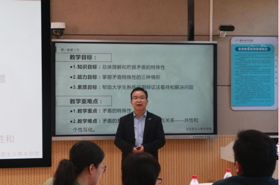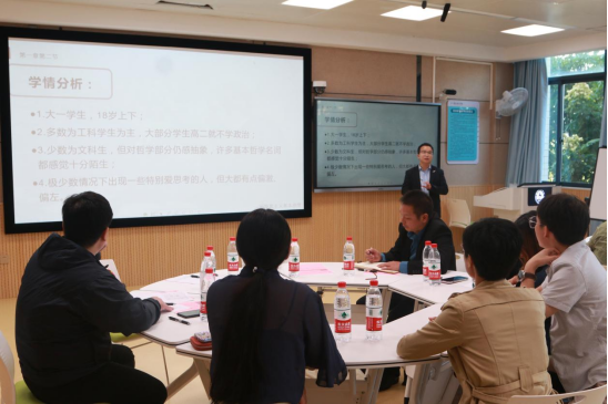 10月15日下午,原理教研室饶筠筠和陆朝森一同参加桂林旅游学院举办的2023年广西高校思想政治理论课多层级集群结对共建研讨会说课活动。此次说课活动共分为教师说课和教师点评两个环节,我院原理教研室陆朝森老师第一个上去进行说课演示,他说课的内容是《矛盾的普遍性和特殊性及其相互关系》,主要围绕教材、教学目标、教学重难点、教法和学情分析以及教学过程等方面展开说课,最后,饶筠筠老师进行点评和总结。